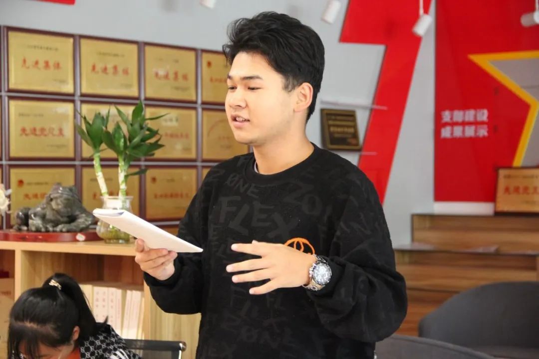 员工代表么晨彬、杨睿、陈梵说到作为新时代的接班人、新青年,同时作为一名光荣的入党积极分子我们要肩负起历史使命,抱有远大理想、努力提高自身素养、调整好自己的心态、摆正好自己的位置、要有能吃苦耐劳的精神、有责任感,并且树立终身学习的观念,通过不断的学习来适应社会,坚定战略自信,保持战略清醒,增强信心斗志,以实际行动贯彻学习党的二十大精神。