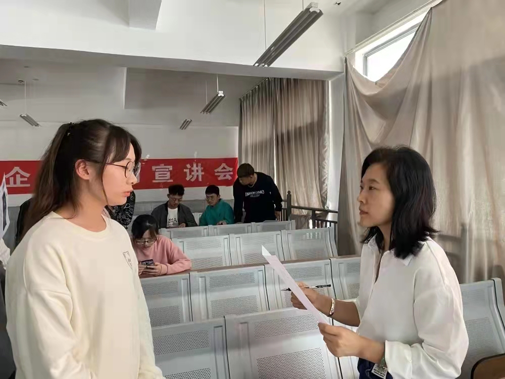 会后,许多同学向自己心仪的企业投出简历,招聘企业也对他们进行现场面试。
