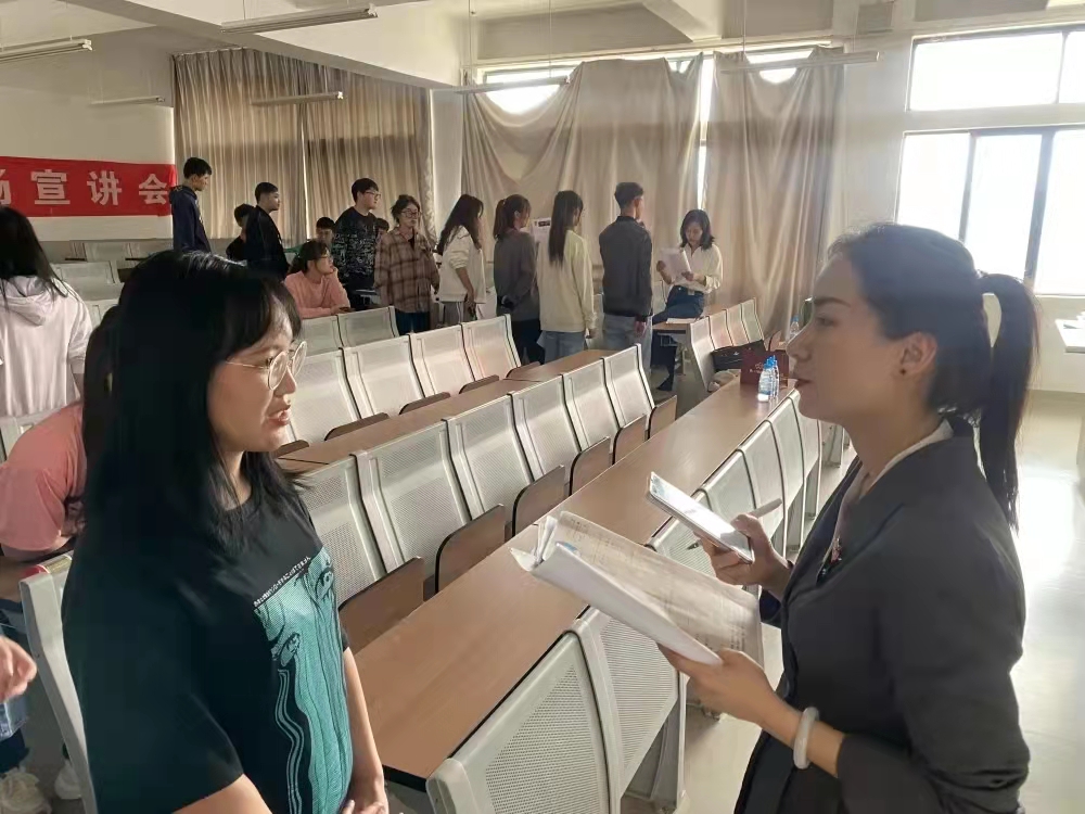 各家企业负责人先后就企业背景、企业团队、企业文化、工资待遇、福利奖金、以及企业发展前景和岗位上升空间进行全面的讲解。每一位企业负责人一边讲解,一边详细解答同学们提出的疑问,不断与在场同学展开互动,消除同学们的后顾之忧。深圳春航商贸有限公司由于客观原因未能到场,因此采用线上会议的方式来给同学们进行讲解和面试。