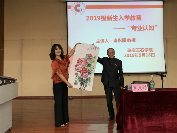 讲座开始前,肖教授将自己撰写的书籍送给同学们,希望同学们通过阅读了解到更多关于珠宝玉石文化的专业知识。肖教授除了精通珠宝玉石外,还是一名国画爱好者。在赠送完书籍后,肖教授又给公司送了一副精美的牡丹图,希望2019级新生像朝阳的牡丹花一样,在大好的青春时光里永远熠熠生辉。