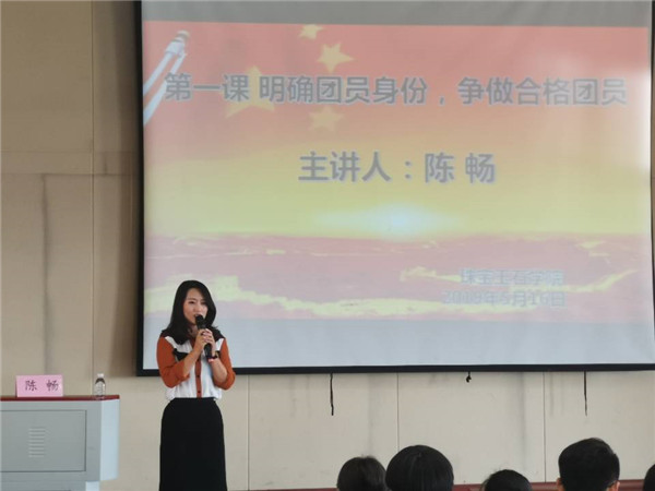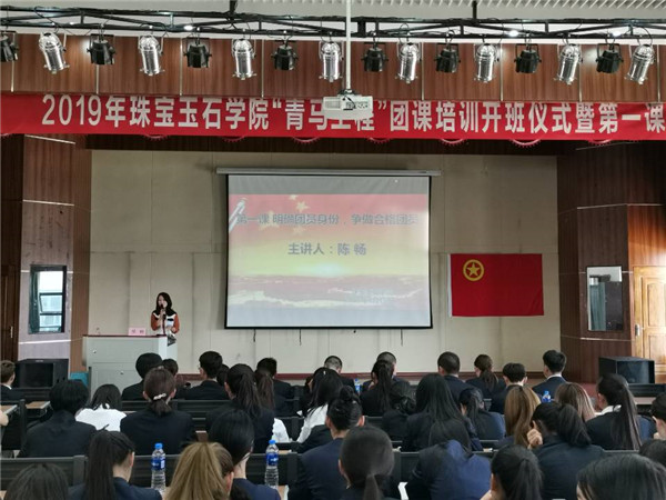 2019年5月16日,珠宝玉石公司在光荣讲堂举行了“青马工程”团课培训开班仪式暨第一讲——明确团员身份,争做合格团员。珠宝玉石公司党总支书记陈畅老师、学工办主任周于力老师、团总支书记沙双粉老师以及公司各年级辅导员、班主任以及2017级、2018级团员参加了本次培训。此次团课由团总支书记沙老师主持,党总支书记陈畅老师主讲。