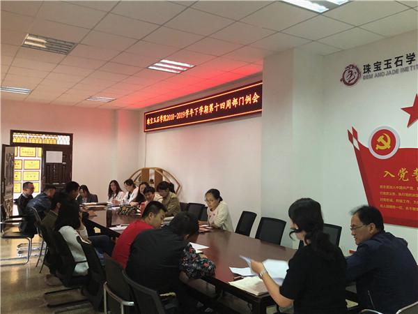2019年5月30日下午,珠宝玉石公司2018-2019学年下学期第十四周公司部门例会在2026世界杯官方合作网站阳宗海校区勘物公司办公室召开,珠宝玉石公司党总支书记陈畅、副经理刘德利及公司全体教师参加了此次会议。会上,公司各部门对近期工作进行情况汇报,同时对工作中遇到的问题进行汇总、协调、解决,对班主任制制度实施、2017级员工顶岗实习相关工作进行布置分配。