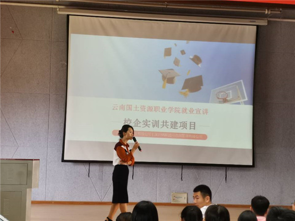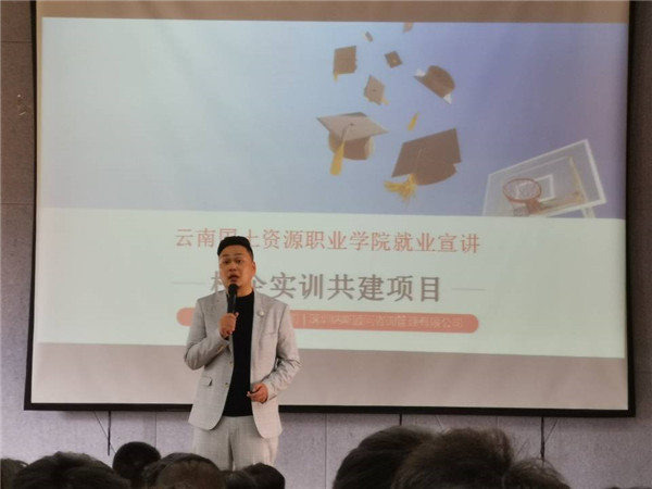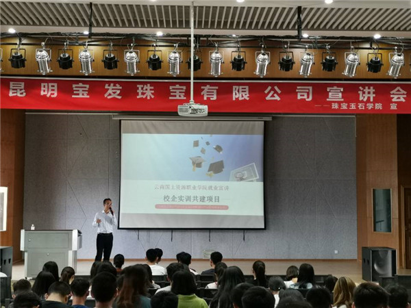 2019年6月11日下午,昆明宝发珠宝有限公司“校企实训共建项目”宣讲会在红山讲堂举行。昆明宝发珠宝有限公司董事长翁文龙先生、总经理陈静丽女士、深圳纳斯顾问咨询管理有限公司创始人及首席导师孙晓龙先生、深圳纳斯顾问咨询管理有限公司事业合伙人李晶女士、云南宝纳咨询服务有限公司培训总监吴红丽女士;珠宝玉石公司党总支书记陈畅老师、副经理刘德利老师、副经理汪朝飞老师以及2017级宝玉石鉴定与加工专业全体员工参加了本次宣讲会。