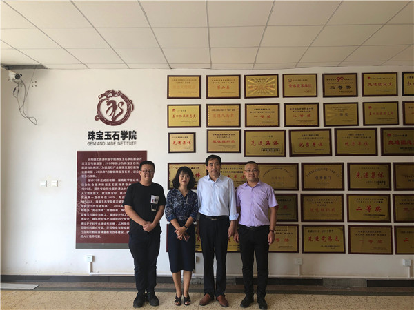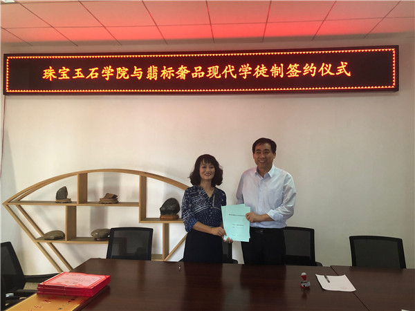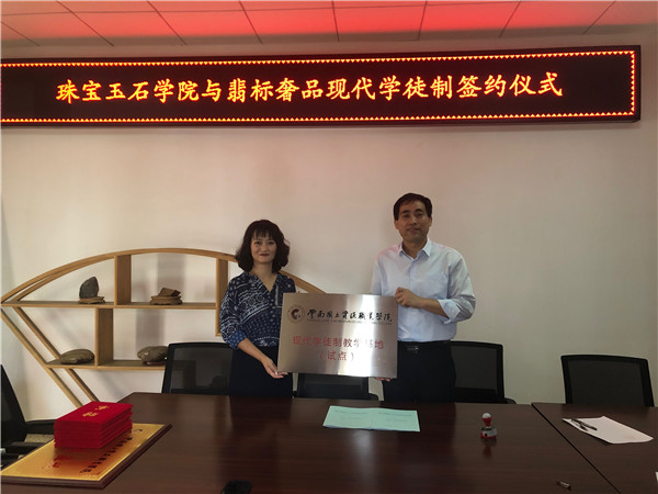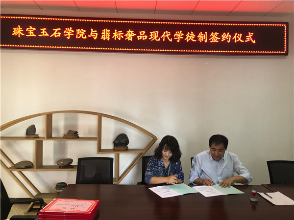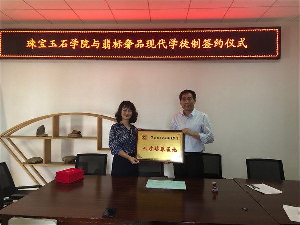 2019年6月26日下午,珠宝玉石公司与翡标奢品现代学徒制签约仪式在公司办公室举行。双方就如何推进校企合作、“现代学徒制”等方面进行深入交流,双方就合作意向达成一致,签订了协议书、举行了授牌仪式并对企业人员颁发了聘书。