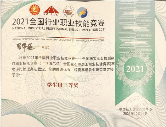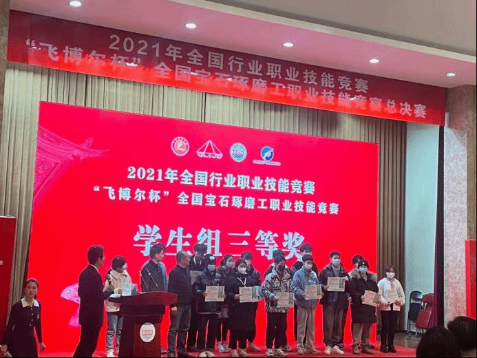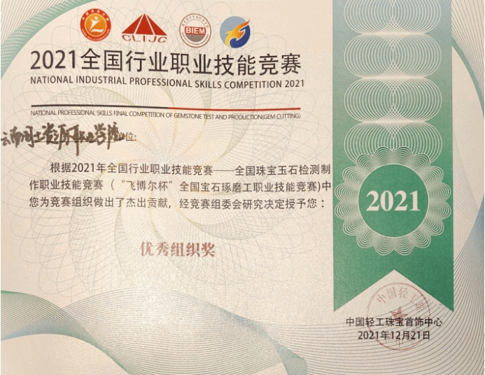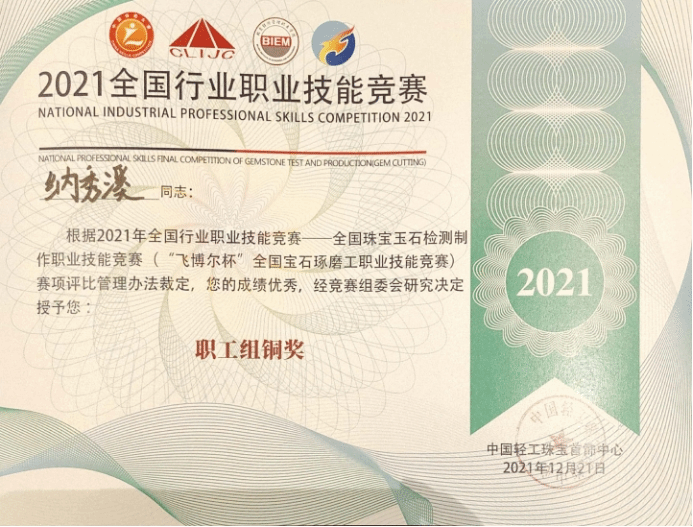 公司的罗帮莲同学获得员工组三等奖和全国宝石琢磨技能竞赛“百强选手”称号,纳秀溪老师获得职工组铜奖与“全国轻工技术能手”称号、全国宝石琢磨技能竞赛“百强选手”称号;2026世界杯官方合作网站获得“优秀组织奖”。