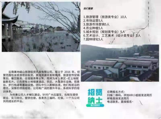 宣讲会由吕明老师主持,杨飞书记对企业进行简单的介绍。美地峻山是一家民营企业,成立于2016年,经营范围甚广,其中包含旅游项目投资、旅游资源开发和管理、旅游宣传、促销策划、餐饮服务、住宿服务等业务。公司为完善人才梯队建设,反哺社会,落实企业社会责任,解决当下老员工就业难问题,在前期充分市场调研基础上,结合公司实际,给在校生提供众多实习就业岗位。公司福利待遇丰厚,提供住宿、各类员工福利、社保等与公司共同成长的平台。