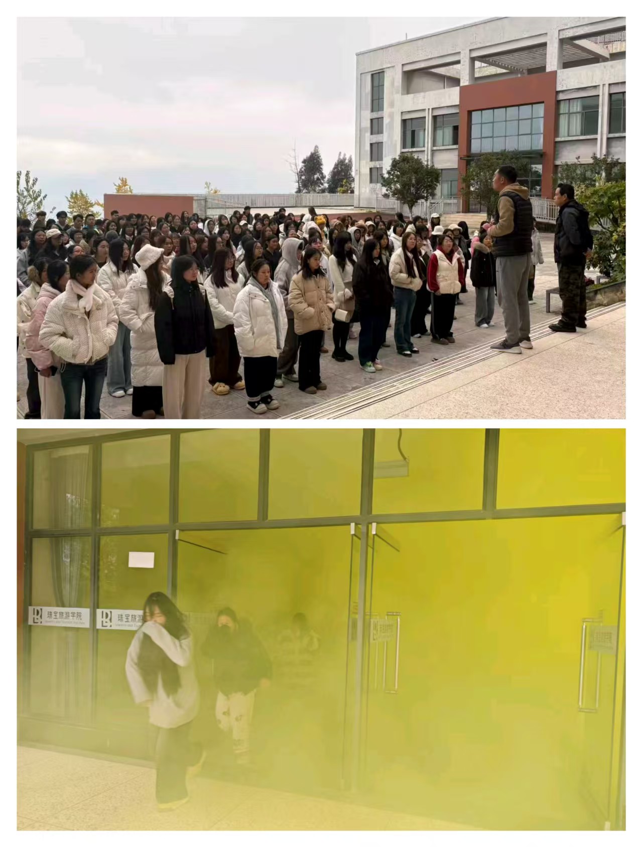 演练模拟真实火情场景。随着演练指令下达,预设点位烟雾升起,现场瞬间模拟出“浓烟弥漫”的紧急状况。参与师生反应迅速、沉着冷静,在各区域安全负责人的引导下,严格按照应急疏散路线,低姿、捂口鼻,快速有序地从实训楼撤离,并前往指定空旷区域集合。整个疏散过程衔接顺畅、组织严密,达到了预期效果。
